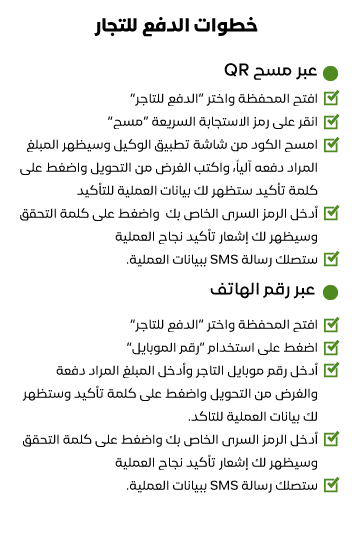 خدمـة تمكنك من دفع قيمة المنتجات أو الخدمات وفواتير الشراء عبـر شبكة واسعـة من التجـار ونقاط الخـدمـة